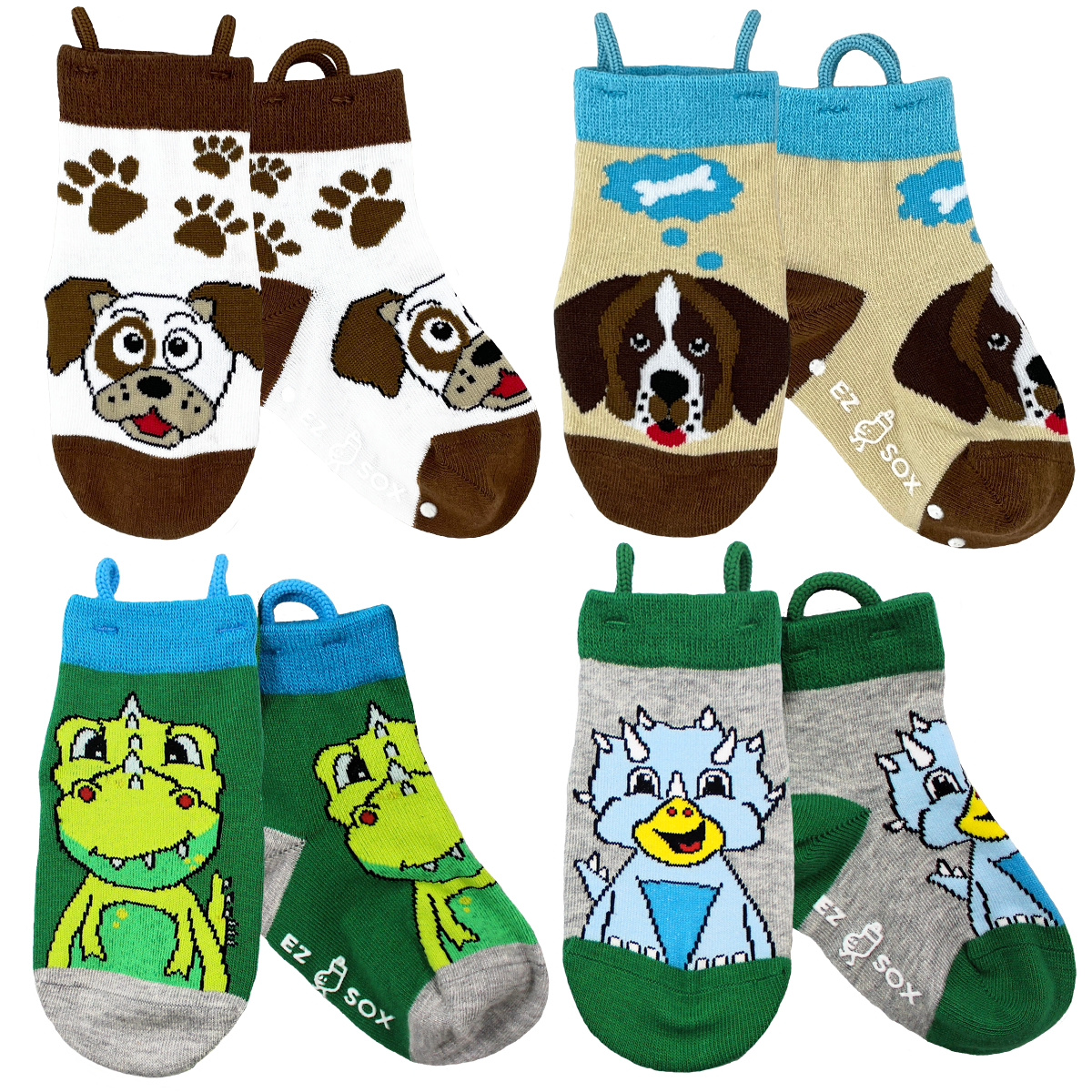 Dogs & Dinos! Our adorable doggie socks are paired with our dinosaur socks. Making a this a great Ruff & Growl irresistible pack for most kids. They just might not want to take them off.