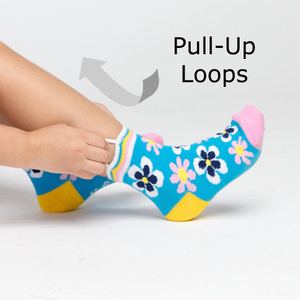Our patented loop technology makes it easy for kids to pull up their socks. Our double reinforced loops are sewn with a bartack machine, which is the same process made for sewing jeans. Even the most Herculean toddler can’t pull them off.